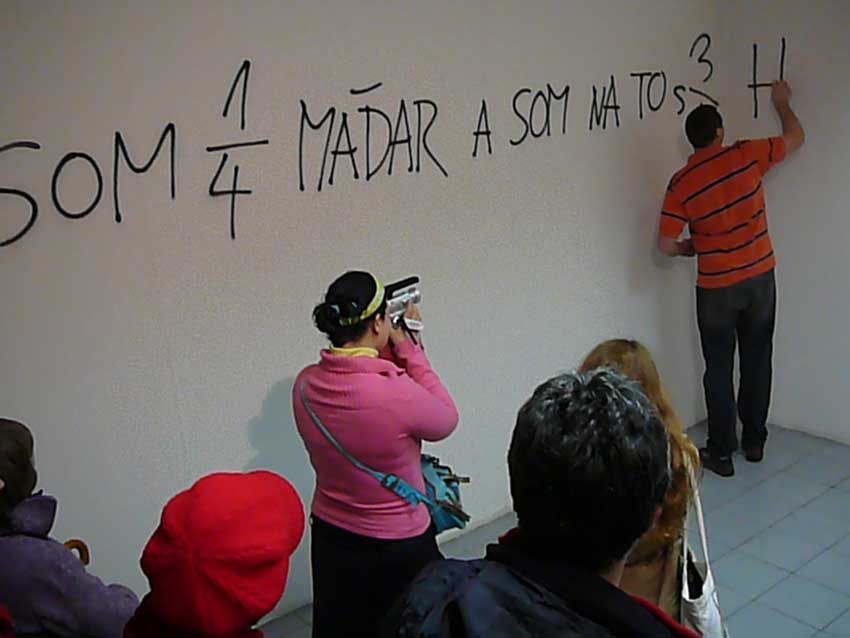 The title of the present show refers to a 2004 work of the Slovakian artist Viktor Frešo when he, in reaction to the anti-Hungarian media statements of the local mayor, sprayed his own statement on the wall of the gallery of Zilina, Slovakia: I’m 1/4 Hungarian and I’m 3/4 proud of it. Thus the exhibition 1/4 Hungarian also searches the ways the meaning and interpretation of a critical enunciation might vary in any different context. Questions whether artworks may help us relate to events and conflict situtations that take place elsewhere, or whether we can develop an ability to view our immediate reality from a new, perhaps relativizing perspective, are also addressed.