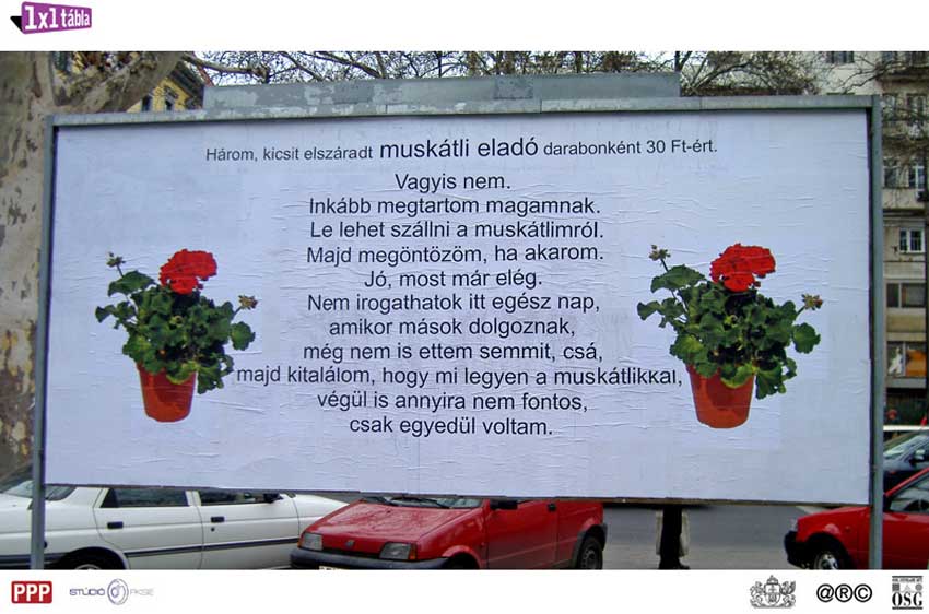 ps.: Tudom már volt ez a muskátlis baromság, de most megcsináltuk óriásplakátba is, s nem bírom ki hogy ne mutassam meg. Ennyi kutyakaka egyébként az egész világon nincs, mint a Lövölde téren. További egyeztetések folynak multinacionális cégekkel, hiszen őket is mérhetetlenül felháborította, hogy a félbolond Irénke néninek óriásplakátra van pénze. Ez nem maradhat ennyiben, hétvégén lecsapunk. Bocsi az RSS miatt, most épp működik, néha nem, ez van, úgyis nem soká elterjed a RSUSGSSSS 7.0 és arra váltunk. Ha valaki nem értette volna, a halastavak a kortárs német opera ellehetetlenülésére, a halfa pedig a dán hegyihorgászat válságára igyekszik felhívni a figyelmet. Mert ezek a dolgok nekünk fontosak.