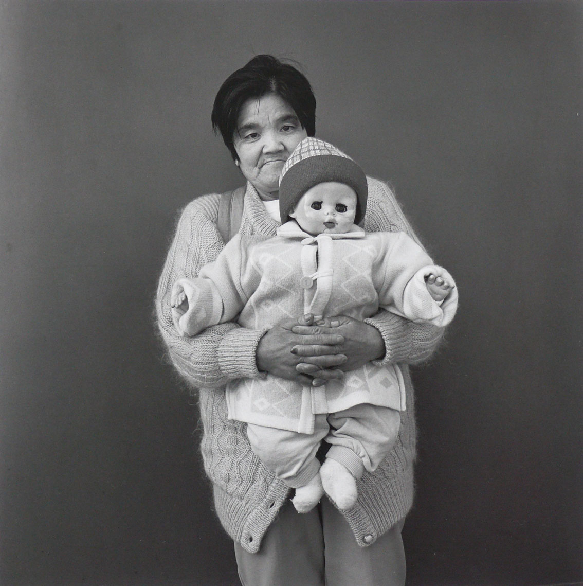 Hiroh Kikai: A woman who told me she’d been raising a doll for twenty-eight years, 2001I tried it out right away. When a husband and wife came in without any kids, yet holding a huge doll, I took some pictures of them separately. For the wife’s caption, I wrote, “A person who has been raising this doll for 28 years.” For the husband, I wrote, “The husband of the person who has been living together with a doll for 28 years.” When I put them next to each other, my imagination started to jump all over the place as though I were watching a television show, and I came up with a scenario that every time the wife changes the doll’s clothes, the husband probably goes off and gets drunk. I thought it was really interesting.