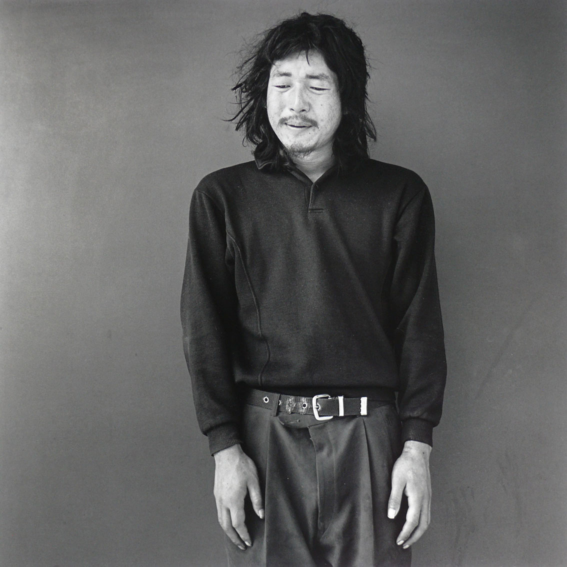 Hiroh Kikai: A young man who walked here from far away / Egy fiatalember, aki messziről sétált ide, 1999Ha már a portrékészítésről beszélünk; szerintem alapvetően fontos, hogy egyszerű hátteret használjunk, ezért használom én a cinóbervörösre lakkozott templomfalat háttérként. Számomra a túlságosan megkonstruált díszletek túlmagyarázzák a dolgokat. A portrékészítés nem egy pillanatok alatt lezajló cselekvés, szerintem sokkal inkább arról szól, hogy a képpel el tudjam csípni a személy egész múltját és minden emberi értékét.