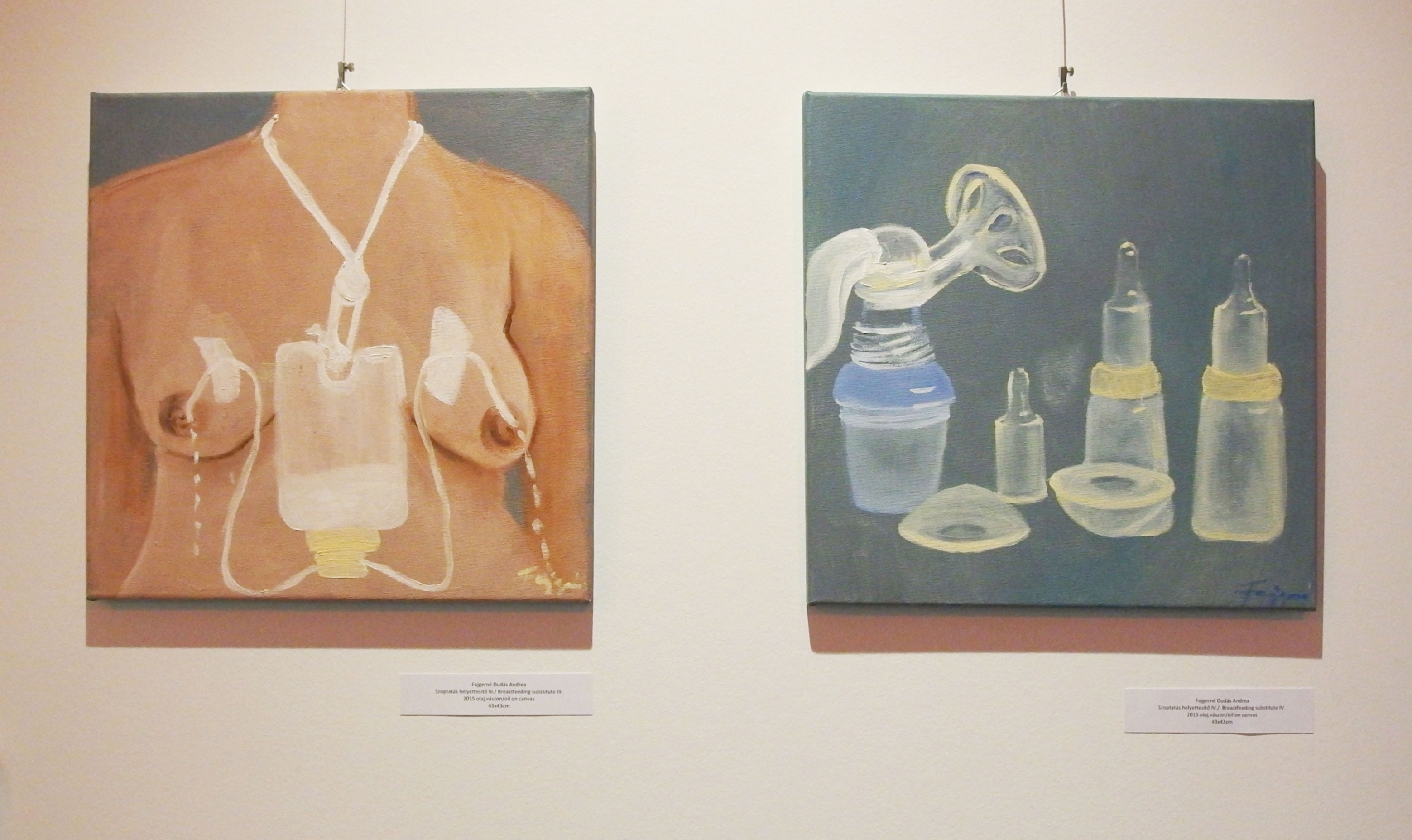 Fajgerné Dudás Andrea: Szoptatás helyettesítő I.-II., 2015, olaj, vászon, (2db 43x43cm)