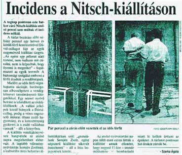 “In Ungarn ist ein Kulturskandal ausgebrochen! Das hier ist Gotteslästerung!”- rief der stellvertretende Staatssekretär für kirchliche Angelegenheiten im ‘Ministerium für das Nationale Kulturerbe der Republik Ungarn’ angesichts eines Ausstellungsarrangements von Hermann Nitsch, im Sommer 1999, im Kiscelli Museum von Budapest. Das Blut getöteter Tiere, die Requisiten von Golgotha und menschliche Schreie, die gleichzeitig mehrere Wahrnehmungssinne des Besuchers traktierten, veranlaßten den ausgebildeten Theologen zu einer entschiedenen Retorsion. Er forderte die Einrichtung eines Untersuchungsausschusses zur Überprüfung der Ausgaben “staatlicher Gelder” bei ähnlichen Ausstellungsvorhaben. Zudem versprach er, dass er für die Schließung der Ausstellung sorgen werde. Seiner harschen Kritik schlossen sich wenig später sowohl kirchliche Verbände als auch der Kultusminister an(1).
