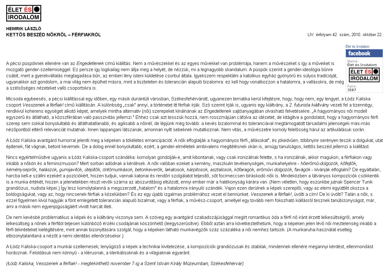LÁSZLÓ: Kettős beszéd nőkről férfiakról / ÉS, 2010.