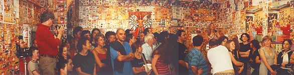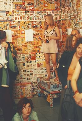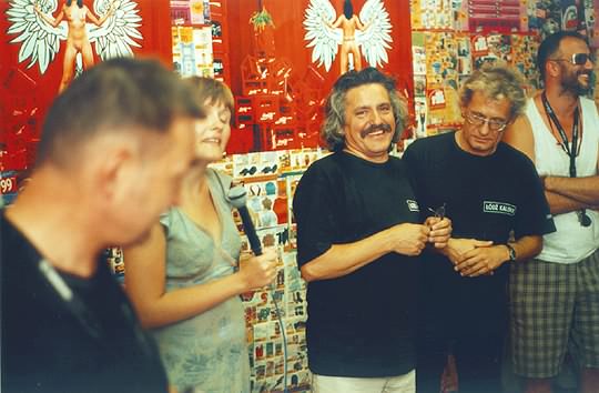 a kiállítást megnyitó "Opera" című performance során a Lódz Kaliska tagjai - az előadás idejére - bezárták a közönséget a galéria helyiségébe (képünkön). A kiállítóterem egyik sarkában egy létrán álló, elegáns öltözékű nő (Rutkai Bori) olvasta fel a csoport New Pop kiálványait (3. kép), míg a túlsó sarokban egy az asztalon álló, hiányos öltözékű nő (Dorotka), kezében Coca-Cola-val, "cola", "cola" közbekiáltásokkal ellenpontozta a felolvasást (2. kép), amely alatt mindvégig Giuseppe Verdi Nabucco című operájának Rabszolga kórusa volt hallható. A csoport időközben az utcán tartózkodó hiányos öltözékű női tagjai a galéria kirakata előtt cipőket próbáltak föl, a férfiak ezt szemlélték, miközben Adam Rzepeczki kerékpárpumpával próbált felfújni egy autógumi-belsőt.