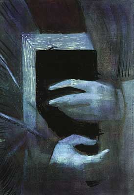 (akril, vászon)A másik Rubljov feldolgozás Andrej Rubljov 1425-27 között a Deiszisz-rend számára készített Szent Pál ikonja nyomán készült. Ennek részlete, a két kézzel tartott könyv részben az apostolok, részben az evangelisták attribútuma. E könyv tehát az Új Szövetségre utal, illetve szélesebb értelemben az Igére - Isten Igéjére -, a Logoszra. A Logosz: értelem, ige, szellem, a világ világossága. Az álló formátum következtében a csukott könyv szélei nemcsak párhuzamosan futnak a festmény oldalaival, de arányaik is azonosak, s így lesz ebből itt egy kép a képben motívum. Ez által válik jelentésessé, hogy a becsukott kötet fedele - a borító, ahol a mi világunkban képnek kellene lennie - fekete, míg a kötet felül és oldalt, azaz oldalról látszó (és persze fordított perspektívában megjelenő) lapjai világoskékek, ahol e kékséget - mint vízfelszint a hullámok -, vízszintesen és függőlegesen is ismétlődő fehér hullámvonalak barázdálják (a kép narrációja is részben erre utal: "mozdulatvíz sodrás/szobrász"). Ha úgy tetszik mindez kép és szöveg, ábrázolás és valóság, látszat és létezés szembeállítása, tehát egyúttal művészi programadás vagy ars poetica is.