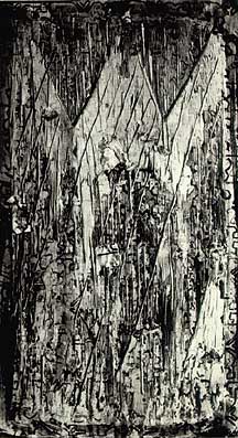(2) Ádám Zoltánnak e csibeetetős képei azóta is gyakran eszembe jutottak. Például mikor később a XIII.századi kínai mester, Ch'en Jung tusfestményeinek reprodukcióit nézegettem, aki bizonyos felületeit úgy alakította ki, hogy leköpködte őket, s a tust saját nyálával elegyítetve kente fel a megfelelő részekre. Ádám Zoltán a csibeetetőit szintén tussal festette, s e fadobozok csibeszarral voltak alapozva. De ahogy Ch'en Jung, úgy ő sem csak valamiféle polgárpukkasztás szándékával nyúlt ezekhez a dobozokhoz, hanem azzal a szakmai alázattal és elragadtatással, amivel azt kell. Mert ahogy pl. a nyál olyasféle vegyületeket tartalmaz, ami - a márványozásnál használatos ökörepéhez hasonlóan - szétnyomja a pigmenteket, úgy a megszáradt csibeszarnak is, ami nyilván valamiféle mész-szerű anyagból (is) áll, megvan az a speciális tulajdonsága, hogy intenzíven issza magába a tust, ami ily módon e felületen mattra szárad. Így a tus feketéje tompává, de egy szelídebb és annál is melegebb szürkévé válik, mintha az ember egy krétára vagy gipszlapra festene vele.