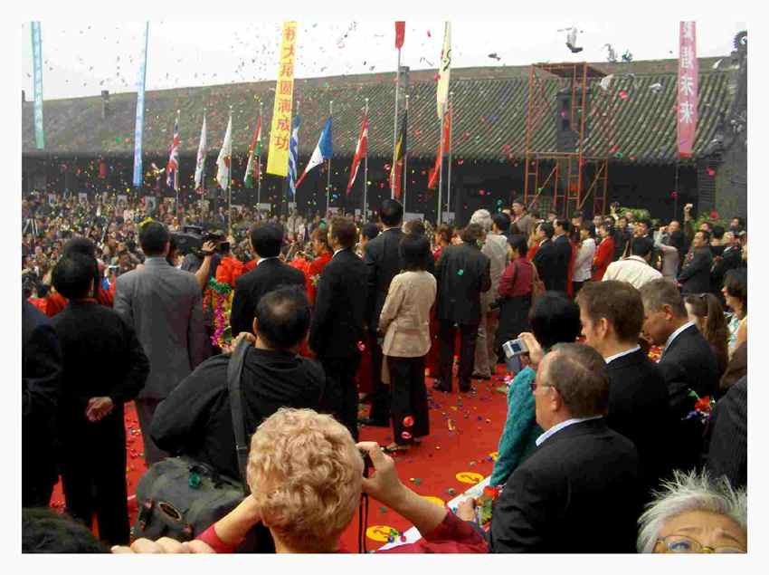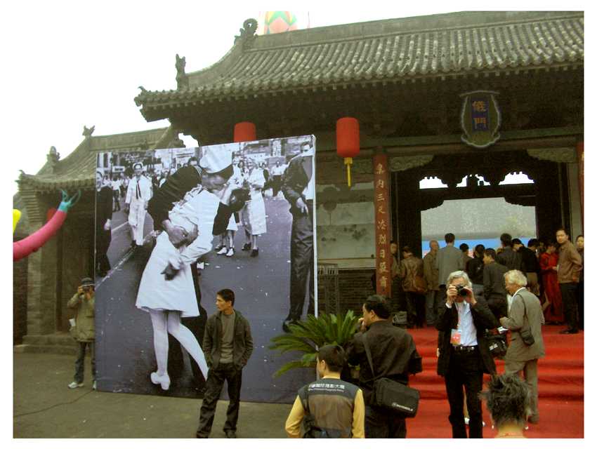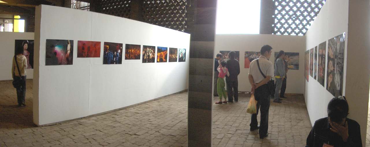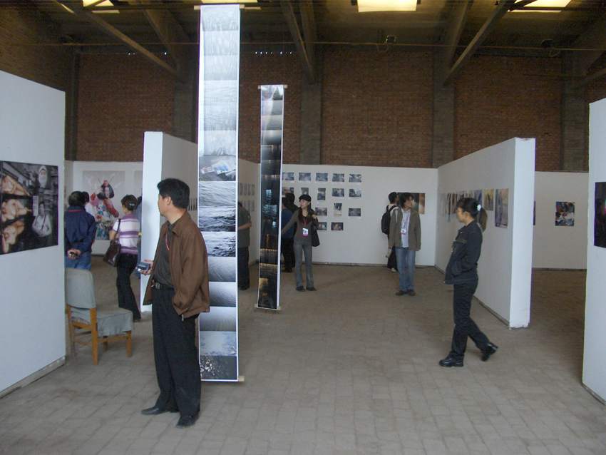 nekünk, külföldi kurátoroknak abban a megtiszteltetésben lehetett részünk, hogy az ünnepséget a színpadról nézhettük végig, igaz, csak a harmadik sorból, diplomaták, katonai- és politikai vezetők háta mögül. Ott állva vettem észre, hogy az udvar jobb és bal oldalán felvont zászlok közt magyar trikolor is lobog. Az ünnepség természetesen a kínai zászló felvonásával és házigazdáink himnuszával vette kezdetét, majd politikusok és diplomaták beszédei következtek.ez a számunkra talán túlméretezettnek tűnő politikai reprezentáció részükről kétségkívűl nem igazán állt arányban az egyes kiállításokra fordított energiákkal. Ebben a vonatkozásban számomra a legnagyobb problémát az jelentette, mikor a helyszínen kiderült, hogy a külföldi fesztiváligazgatóval lelevelezett 6 darab 8x4x8 méteres box helyett csupán 4-et kapunk. E boxok falainak méretei ugyancsak eltértek attól, amikről korábban tájékoztattak bennünket, illetve a c-printeket nem kassirozták föl habkartonra, ahogy igérték, s a kiállítás installálásához - egy létrát leszámítva - semmiféle eszközt és anyagot nem biztosítottak. Utóbbira a tavalyi tapasztalatok alapján kurátor kollégáink fölkészítettek bennünket, így a magunkkal vitt szög-, ragaszó-, és szerszámkészletek végül elegendőnek bizonyultak. Másfelől viszont - házigazdáink figyelmetlenségeinek következtében - számos esetben kényszermegoldásokkal kellett beérnünk, s akkor még nem beszéltem a nem megfelelő világításról vagy arról, hogy végülis nem mindent fordítottak le kínaira, illetve, hogy a fesztivál album terjedelmű katalógusa nemhogy a kurátorok szövegeit és a művészek statementjeit nem tartalmazza, de még a házigazdák által kiválasztott reprodukciók címeit sem.