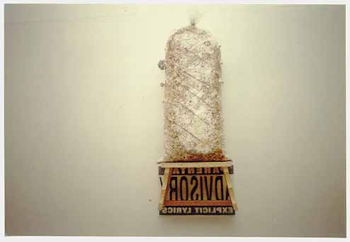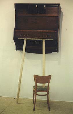 - mushroom bed, overall, hair-dryer, stool, notice), 1994As in the years of the starting of the gallery there were only a few independent exhibition places, the Liget Gallery consciously did not define its own profile. Everything that did not find a forum elsewhere came up as an alternative of the existing official art, thus as a presentable possibility, a possibility to be presented. The aim was the conveyance of the most remarkable tendencies from among these. And as new painterly expressionism, firstly among the new tendencies in the fine arts, entered the large institution, the Liget Gallery, taking a somewhat oppositional standpoint, preferred the other tendencies which developed after the neoavant-garde: new wave, postconceptualism and the intermedial endeavours. Thus performances, actions, videos, photos, installations appeared in the offer of the gallery, as well as that what counted as new within the traditional genres, e.g. in graphics.