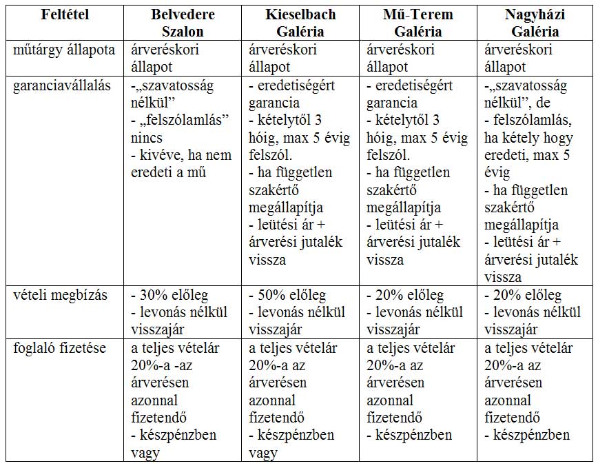 Lássuk előbb (a táblázatban) a magyar aukciósházak árverezési feltételeinek rövid, a verseny szempontjából megfogalmazható kivonatát.Feltétel Belvedere Szalon, Kieselbach Galéria, Mű-Terem Galéria, Nagyházi Galéria