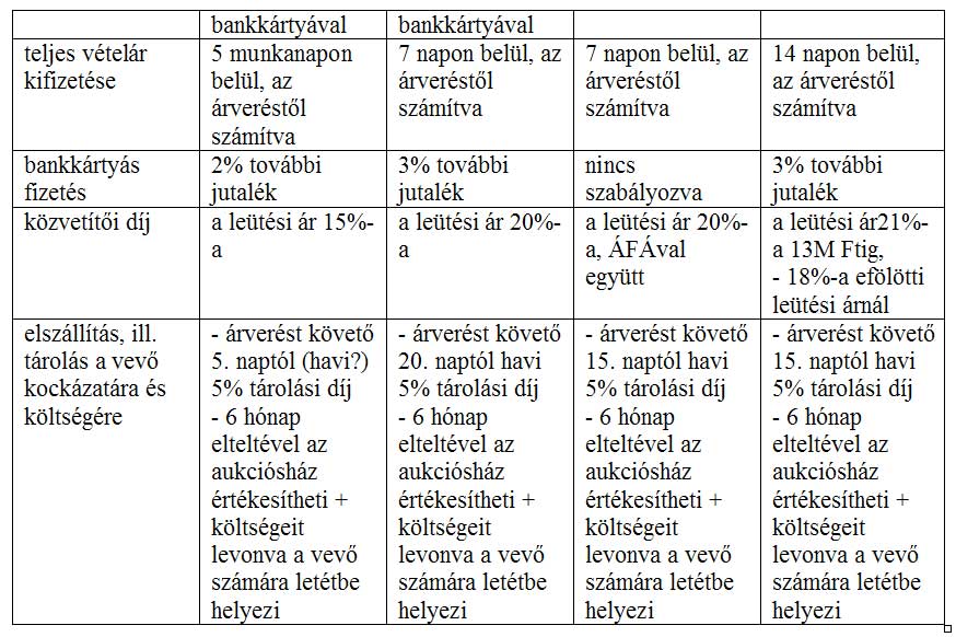 Lássuk előbb a következő táblázatban a magyar aukciósházak árverezési feltételeinek rövid, a verseny szempontjából megfogalmazható kivonatát.