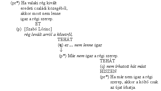Az okozati–oki viszony elemzése feltárja, hogy a hát-tal jelölt következtetésnek (nem írhatott hát mást) a szövegben nincs nyelvileg kifejezett, explicit következtetési alapja: kis és nagy premisszája. Az érvelési műveletnek ezt a két — itt — implicit tételét a partnernak kell rekonstruálnia. Rá kell jönnie, akár kutató, akár spontán olvasó a partner, hogy a nyelvileg ki nem fejezett kis premissza azonos azzal a kijelentéssel, amely az előző érvelésben a konklúzió szerepét töltötte be (Már nem igaz a régi szerep). A konklúzió továbblépését a kis premissza szerepébe a [III] séma jeleníti meg. A séma tartalmazza — a (pr*)-gal jelölt — implicit általános tudáselemeket is. [28]
