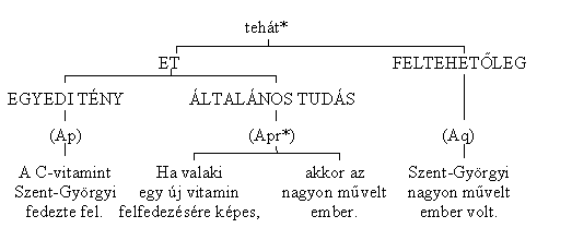 A konvencionális tudás (pr*) és az aktuális tény (p) közös eleme (vitamin felfedezése) egymáshoz rendeli a (p) (Szent-Györgyi) és a (pr*) (nagyon művelt ember) együtt ebben a szövegben eddig nem szereplő részleteit, s ezekből létrejön a konklúzió (jele: q):