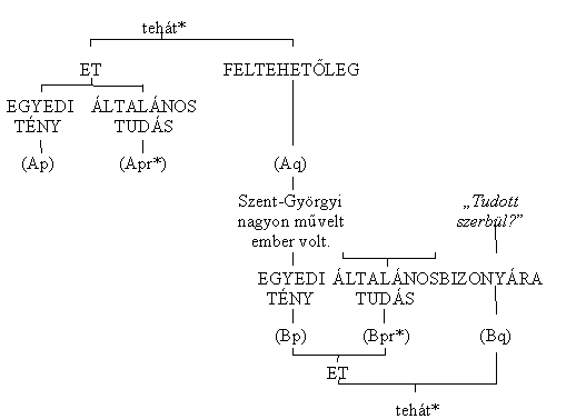 A) konklúzió, vagyis (Aq), a második szillogizmusban (jele: B) már egyedi tény, jele ezért (Bp):(Aq) Szent-Györgyi nagyon művelt ember volt.