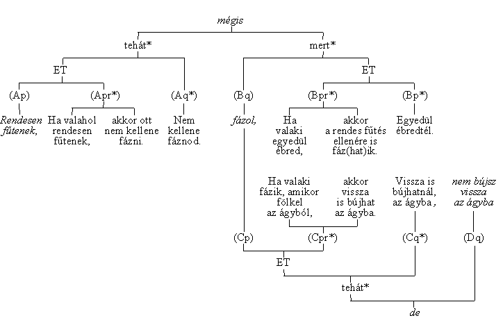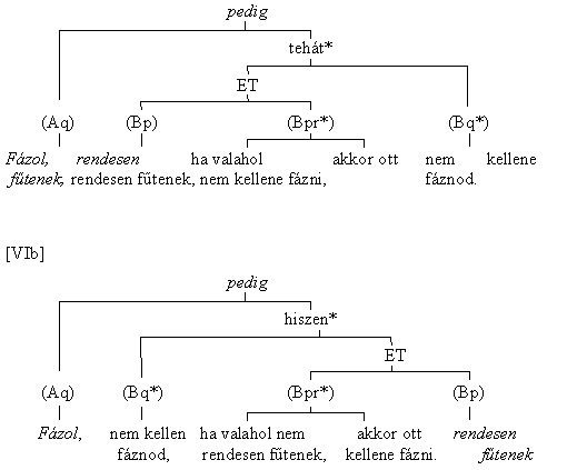 A [VIa] és a [VIb] csupán sorrendi változatai egymásnak. A [VIa]-ban a fázol-nak ellentmondó tény, (rendesen fűtenek), vagyis a (Bp) jön előbb; a [VIb] az implicit konklúziót, vagyis (Bq*)-t helyezi előre: (Aq) fázol, pedig (Bq*) nem kellene fáznod.
