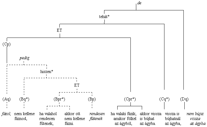 ótag implicit volta miatt — bonyolultabb, mint amilyen a (3) példa volt. De a (4)-ben is ugyanaz a lényeg, ami a (3)-ban. Az a kijelentés (fázol), amely a mégis-sel viszonyított ellentétes szerkezet utótagjában konklúzió (Bq) volt, az a de-vel viszonyított ellentétes szerkezet előtagjában kis premissza (Cp).(4) „... felébredtél és nem tudsz elaludni, |