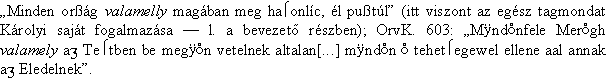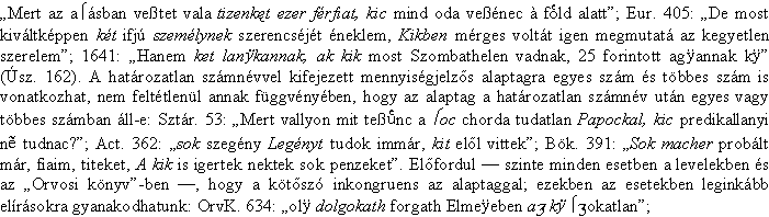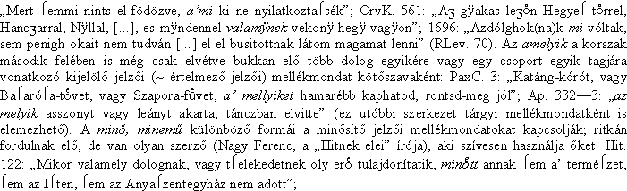 mint, mind a következményes hogy a vonatkozó kötőszó szerepét is magába szívja (következményes példa a próbafejezet anyagában nem akadt). A mellékmondat élén a sajátos jelentéstartalomra jellemző kötőszó helyén mindkét típusban állhat vonatkozó kötőszó is (a feltételes hasonlításban azonban nem) — ebben az esetben a sajátos jelentés, bár éppúgy ott lappang a mellékmondatban, kevésbé hangsúlyos. (A kétféle kötőszó a különböző korokban egyszerre is megjelenhet. A mint mellett a későbbi korszakokban szerepelhet vonatkozó kötőszó, de sem az ómagyar, sem a középmagyar kor jelzői mellékmondataiban még nem találjuk meg ezt a szerkesztésmódot. A hogy mellett pedig korábban fordult elő gyakrabban vonatkozó kötőszó — l. a kései ómagyar hogyki, hogymely kötőszóegyütteseit —, de a most vizsgált korszakban már csak alig, a későbbiekben pedig egyáltalán nem.) A megengedést a vizsgált korban a vala- előtagos vonatkozó kötőszói forma [201] fejezheti ki: 1737: „a szép ruhájok abbul állot hogy csak egy abroszt reájok terétettek, s mingyárt szép ruhák lettek valaminemöt gondolt” (Bosz. 1: 542).A hasonlító jelentésárnyalatú minőségjelzői mellékmondatok — melyek a részleges