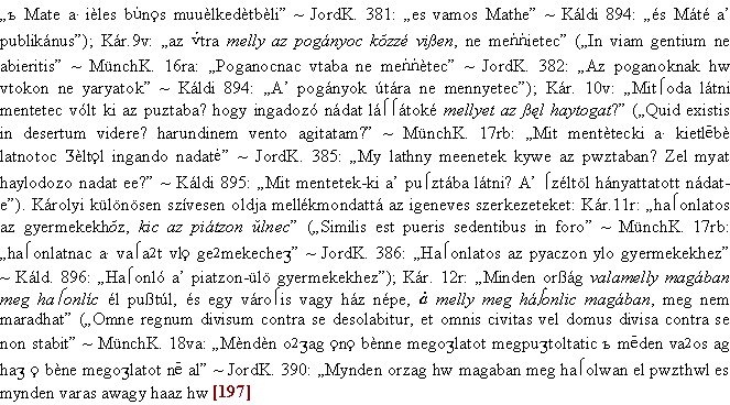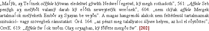 XVII. század: Káldi György: Szent Biblia. Mt. 10—12. (1626.) Buda, 1782. 894—7. (Káldi); Rimay János versei. (1631 e.) Eckhardt Sándor, Akadémiai, 1956. 11—8. (Rim.); Pázmány Péter: Prédikációk. 1636. Kanyurszky György, Magyar Királyi Tudományegyetem Nyomdája, 1903. 215—31. (Pázm.); Gyöngyösi István: Mársal társolkodó Murányi Vénus. (1664.) Badics Ferenc, Akadémiai, 1937. 152—167. (Gyöngy.); Actio Curiosa. (1670.) RMDE 2. Kardos Tibor, Akadémiai, 1960. 357—73. (Act.); Pápai Páris Ferenc: Pax corporis. 1690. 1—17, 390—5. (PaxC.); Bethlen Miklós önéletírása. (1710 e.) V. Windisch Éva, Akadémiai, 1955. 271—81, 544—56. (Beth.); Rákóczi Erzsébet levelei. Uhl Gabriella, Lymbus füzetek, Szeged, 1994. 54—5, 70—3. (RLev.); Úriszék. L.m.f. 161—2, 168—9, 254—5, 276—80, 280—81, 361—2, 375—6, 454—5, 686—9, 691. (Úsz.)