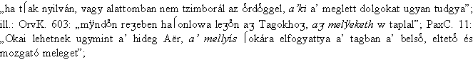 datait idézzük): Kár. 9v: „Hanem mennyetek inkáb az Izraelnec hazánac el téueledet iuhaihoz” ~ Káldi 894: „Hanem inkább mennyetek a’ iuhokhoz, mellyek elvea) A kötőszó. — A vonatkozó kötőszó — a hasonlító és a következményes jelentésárnyalatúak egy részének kivételével — az összes ide tartozó mellékmondatban szerepel. Általában a mellékmondat élén áll; kivételesen azonban más helyre is kerülhet: OrvK. 485: