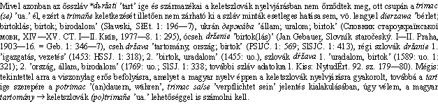 Ezzel kapcsolatosan nem hagyható figyelmen kívül a keletszlovák (po)trimaňe ’birtok, uradalom; tartomány’ származékszó sem, vö. 1575: “... se ti liudze sz wasoho trimanya..., kdis bi buli tu pily na winye Wo wranouie w nasem varosu...” (Slovenská reč. Bratislava. = SR. 38: 188), 1752: “Bíwal v Egyipszkém Trimanyú »lakott Egyiptom tartományában«” (Király Péter, A keletszlovák nyelvjárás nyomtatott emlékei. Bp., 1953. = KNyNyE. 234), 1778: “Visztri szvojú ochranyujútzú i poratujútzú pravitzu na naso potrimanyé” (AAPNy. 12/C: 268), XVIII. század: “dwa procesy nasse, totižto geden na odebranya harencoch palenčanych we celym trimany biskupskem” (Historický slovník slovenského jazyka. I —. Vedecký redaktor Milan Majtán. Bratislava, 1991. = HSSJ. 3: 167. odobranie alatt), keletszlovák trimane ’birtok’ (Kálal 724).