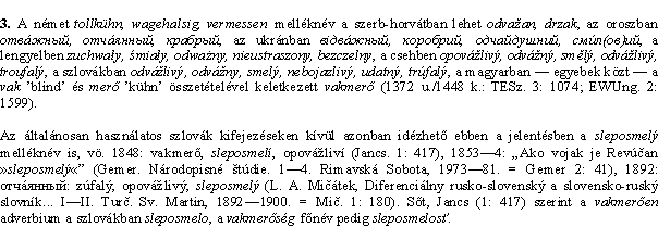 sleposmelý a szlovák népnyelvben létezett — esetleg létezik ma is —, amint azt a 1853—4. évi Gömör megyei adat is tanúsítja. Aligha lehet kétséges, hogy a szláv nyelvekben teljesen társtalan sleposmelý melléknév a szlovák nyelvi szabályoknak megfelelően formálódva a magyar vakmerő lefordításával keletkezett; a sleposmelosť főnév forrása pedig a magyar vakmerőség ’Tollkühnheit, Wagehalsigkeit’ (1372 u./1448 k.: TESz. 3: 1074) származékszó. A tükörfordítás esetleg a katonáskodáshoz kapcsolható, legalábbis a nagyrőcei katonára vonatkoztatott sleposmelý támogatja ezt a feltételezést.4. Vannak rá példáink, hogy a jogi vonatkozású régi iratokban a szlovák palica és prút nem a szokásos ’pálca, bot, vessző’ értelemben használatos, vö. 1594: “... žebi ho byl trymy palycyamy dal bity, kdiby nemoczny nebyl... [... = három pálcával verette volna,...]” (Stanislav, DejinySlJaz. 3: 165), 1626: “žeby kazdy patek wtydny pruty trema byty bil prj zamku [= hogy ... három vesszővel/bottal megverjék...]” (OL. NádLt. Okiratok I. 333). Bizonyos, hogy az idézetekben lévő trymy palycyamy, illetve pruty trema szintagma jelentése nem ’három pálca; három bot ~ hár vessző’, hanem ’három botütés’.