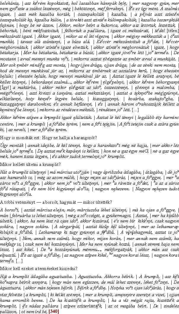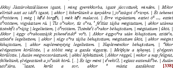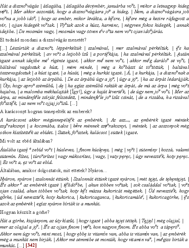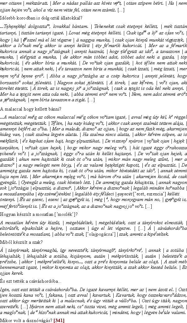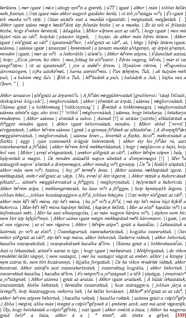 Néhány technikai megjegyzés a lejegyzéshez: A mondathatárok kijelölése néhol problematikus volt, mivel a grammatikai és intonációs mondatjegyek nem azonos irányba mutattak. — Az adatközlő hangsúlyos helyzetben egyes középső nyelvállású magánhangzókat (ë, o) és a diftongusok (ëi, ou) előtagjait gyakran kissé nyíltabban ejti. Ennek következetes jelölése gondot okozott, csak a tisztább eseteket tüntettem fel. — A tegező forma oka az, hogy az adatközlő a nagyapám. Rövid idő elteltével hozzászokott a magnetofonhoz, s ez elősegítette az archaikusabb formák előjövetelét. — Végül szeretnék köszönetet mondani tanáraimnak: Gerstner Károlynak és Juhász Dezsőnek a lejegyzésben nyújtott segítségükért.
