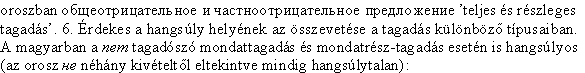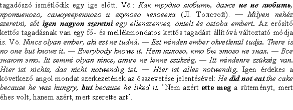 3. A kettős tagadást tartalmazó, erős állítást kifejező mondatok a magyarban ritkábban fordulnak elő, mint például az oroszban. Kettős tagadással többnyire modális jelentések kifejezésekor találkozunk, amikor az egyik tagadószó a modális ige, a másik pedig a főige előtt áll. Vö. Ezt nem lehet nem tudnod. — Ezt tudnod kell. Ezt a lányt nem lehet nem szeretni. — Ezt a lányt mindenki tudja szeretni. Ezen nem lehet nem nevetni. — Ezen az embernek nevetnie kell. Az orosz nyelvjárásokban olyan kettős tagadás is [309] előfordul, amikor egy