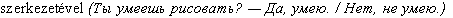 — Kannst du nicht zeichnen? — Doch, ich kann zeichnen. / Nein, ich kann nicht zeichnen. Tudsz rajzolni? — Igen, tudok. / Nem, nem tudok. — Nem tudsz rajzolni?