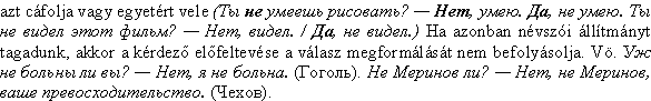 8. Az állító és tagadó kérdőmondatok szinonímiája. — Az állító és tagadó eldöntendő kérdések általában két ítélet (propozíció) közötti ingadozást fejeznek ki, szinonimitásuknak a foka azonban az egyes nyelvekben eltérő lehet. Az angolban az állító és tagadó formában feltett eldöntendő kérdések mindegyikére válaszolhatunk állító vagy tagadó kijelentő mondattal. Vö. Can you draw? — Yes, I can. / No, I can’t. Can’t you draw? — Yes, I can. / No, I can’t. Az orosz, a német és a magyar nyelv azonban azt bizonyítja, hogy ezeknek a kérdéseknek a szinonim volta nem jelenti használatuk azonosságát is. Ezekben a nyelvekben az állító és tagadó kérdések nemcsak a kérdező ingadozását fejezik ki egy állító és egy tagadó propozíció között, hanem implicite kifejezik a kérdező előfeltevését, remélt válaszát is a kapott válasz állító vagy tagadó voltát illetően. Az oroszban az állító kérdésre adhatunk állító és tagadó választ is, és a mondatot bevezető igen és nem szinkronban van a kapott válasz állító, illetve tagadó