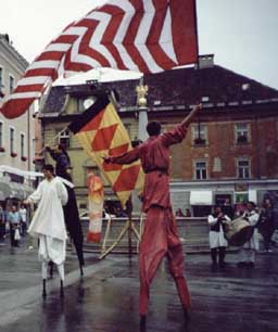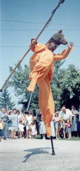 Gólyalábas, maszkos, mutatványos, zenés menet