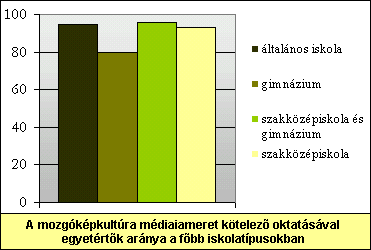 A vizsgálat eredménye azt mutatja, hogy (a területre vonatkozó elemi információk birtokában) a pedagógusok 93%-a egyértelműen a kötelező stúdiumok körébe illesztené a mozgóképkultúra és médiaismeretet! (Az általános iskolai körben ez az arány 95%, de még az elképzelést kevésbé elfogadó gimnáziumi körben is 80%).