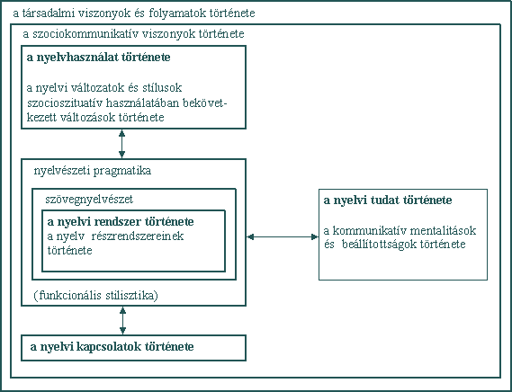 Ami ebből a felosztásból a nyelvtörténeti kutatások eddigi kérdésfeltevéseinek és eredményeinek tükrében mindenesetre világosan látszik, az egyrészt a nyelvtörténet tárgykörének lényeges bővülése, másrészt – az új kérdéskörök megjelenésével szoros összefüggésben – az arányok eltolódása a belső és a külső nyelvtörténet szerepe és helyzete között. 1. ábra. A nyelvtörténet tárgykörei |