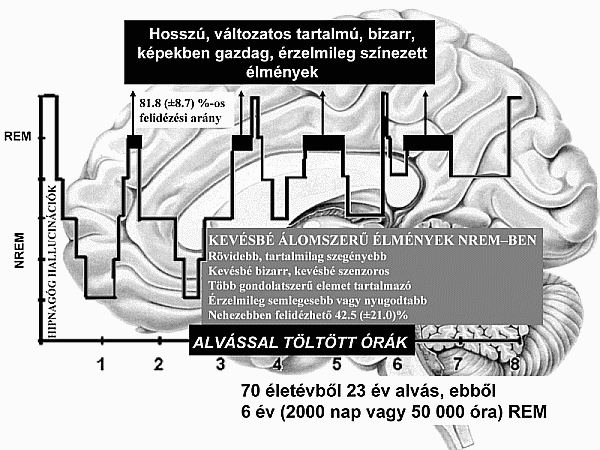 Az álmokkal való tudományos foglalatosság utoljára az 1950-es években kapott jelentős és egyben máig ható lökést, amikor Eugene Aserinsky és Nathaniel Kleitman (1953) jóvoltából ismertté vált az alvás és ezzel együtt az álmodás viszonylag nagy megbízhatósággal előre jelezhető ciklikussága (1. ábra). Az álmodásnak és a gyors szemmozgásokkal jellemezhető, ún. REM (rapid eye movement) alvásfázisnak a gyakori együttjárását a későbbi alváslaboratóriumi vizsgálatok is alátámasztották. A REM szakaszokból ébresztett kísérleti személyek az esetek több mint 80%-ában számolnak be álomélményekről, míg ugyanez az arány a szemmozgásokkal nem kísért, ún. non-REM (NREM) szakaszokban alig több mint 40%-os. A REM alvásból és a NREM alvásból való ébresztést követő beszámolók ráadásul minőségileg is különböznek: a REM alvást inkább a természetes körülmények között felidézett álmokhoz hasonló élénk, érzékletes képek, erőteljes érzelmi élmények, bizarrság és többnyire bonyolult történetekké szerveződő változatos tartalmak jellemzik. Ezzel szemben a NREM alvásból ébresztett személyek beszámolói inkább gondolati és emlékezés jellegűek, kevésbé képiek, kisebb mértékű bizarrság jellemzi őket, és kevésbé emocionálisak is az előbbieknél (Nielsen, 2000). Az ébrenlét és az átmenet határán szintén átélünk a REM alvásban tapasztaltakhoz hasonló élénkségű álomképeket (ún. hipnagóg hallucinációkat), ezeket azonban rendszerint elfeledjük az őket követő hosszú alvás miatt (1. ábra).