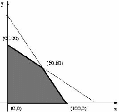Nézzünk egy konkrét, számokkal illusztrált példát, ami a Theodícea 215. pontjában szereplő fejedelem lehetőségeit írja le! Az egyszerűség kedvéért csupán két szempontot vegyünk figyelembe: a szépséget és a kényelmet. Legyen egy város szépségének a mértéke x, a kényelemé y valamilyen módon számszerűsítve. Egy lehetséges várost tehát egy (x,y) számpárral jellemezhetünk. Ezekre valamilyen korlátozó feltételek állnak fenn. Tegyük fel, hogy valamilyen gyakorlati okok miatt az alábbi két korlátunk van: 3x+2y£300, illetve 2x+3y£300. A sík minden egyes pontja megfelel egy (vagy több) lehetséges városnak.
