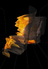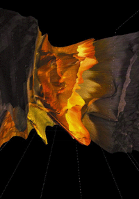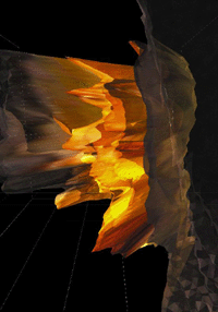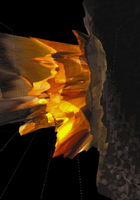 The interface of Camouflage is an ultrasonic position tracker built into a torch: the position measured by the tracker directs the position of the viewpoint in the virtual space. By walking in the exhibition room while holding the navigation-device the visitor can explore the dynamically changing virtual space, in which the geometry of the scene is continuously being modified according to the viewer’s motion. By approaching the projection screen (virtually stepping through the picture) the visitor can step into a new space: in a certain distance the virtual world will automatically switch to the next room, where other worlds await the visitor. |