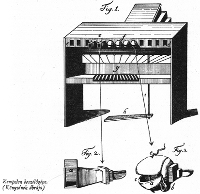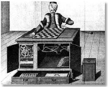Talán a legismertebb automata Kempelen Farkas híres Török sakkozója, mely Tendler automata cirkusza mellett a XVIII. Század legnagyobb szenzációja volt. (Utóbbiban fél-életnagyságú ember és ló bábukkal élethû lovasjátékokat mutattak be, az emberfigurák célba lôttek, labdáztak, fel-le ugráltak a lovakra, és fantasztikus mutatványokat mutattak be.) Mint tudjuk, Kempelen sakkozója ügyes szemfényvesztés volt, valódi sakkozó rejtôzött a szerkezetben. Az igazi invenció -- a mai bûvészek tükrös-eltüntetô rendszerén kívül, mely a szerkezet ajtajainak kinyitása után meggyôzte a gyanakvó közönséget -- a mozgatószerkezet, illetve a szerkezet belsejében helyet foglaló sakkozó "periszkópjai" voltak. A díszesen felöltözött, sakkozás közben pipázó török azért játszott bal kézzel, mert az elbújtatott sakkozó így fért könnyen hozzá a mozgató szerkezethez. Maga a mozgató erô rugó volt, melyet játszma közben töbször fel kellett húzni. A mozgató szerkezet pantográf volt, mely a hatvannégy kocka közepére tette lehetôvé a pontos kézleereszkedést. Mielôtt továbblépnénk,meg kell hogy emlékezzünk Kempelen beszélôgépérôl, mely feltalálója számára jóval fontosabb, szinte egész életpályáját betöltô feladat volt, melynek során komoly nyelvészeti és fonetikai felfedezéseket tett. Beszélôgépét és sakkozóautomatáját ugyanazon a turnén mutatta be, elôbbit azonban igen csekély érdeklôdésre méltatták, míg a Török halála után Amerikába került, ahol az új tulajdonos (Nepomuk Maenzel) még némi modifikációkat is végzett rajta -- eredetileg sakkot adva a török csak bólogatott, immáron viszont a "sakk" szót ismételgette. Amerikai turnéi során Edgar Allen Poe is találkozott a törökkel, mely a gyûjtô halála után a philadelphiai múzeumba került, és ott is pusztult el az 1854-es tûzben.