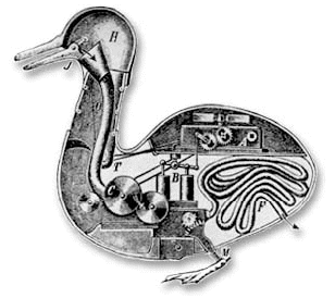 A "biológiai automaták" következô szenzációi Jacques de Vaucanson (1709-1782) és Pierre Jaquet Droz (1721-1790) automatái. Vaucanson a fizikus, gyártulajdonos és feltaláló Grenoble-ben született, és a jezsuitáknál tanult. Az egyháztól való távozás után az emberi test "mozgó anatómiájával" kezd foglalkozni, megcélozva az orvosi gyakorlat és kutatás segítését mechanikus modellek készítésével. Terve sosem sikerült, azonban Vaucanson készített három hihetetlenül népszeû automatát, melyek közül a legnépszerûbb -- ugyan ember helyett kacsa formájában -- megvalôsította az eredeti " mozgó anatómia" célkitûzéseinek egy részét.