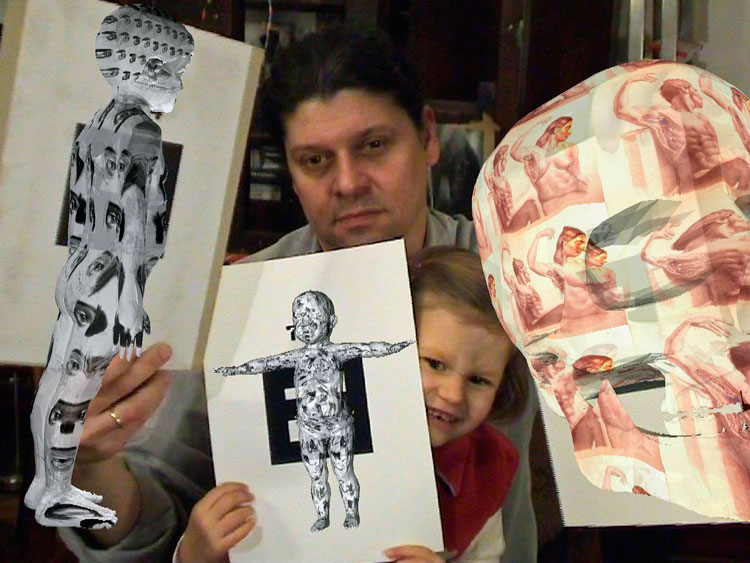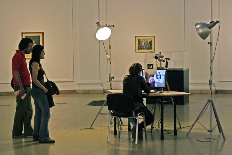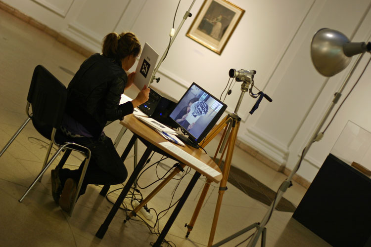 An installation is placed in the exhibition space, which resembles the photographic apparatus used in photo studios for taking identity card photos. The only difference is that there is a table in front of the model, with a monitor on its top - resembling the usual video-telephoning apparatus of our time. Lying on the table, there are a few A4 size cards with unintelligible geometric patterns. The visitor receives the following instruction: sit down at the table, and show the cards placed on it to the camera. Settling by the table, the visitor will see her/his own mirror image shown by the video camera that replaces the photo camera. When the visitor lifts the cards and shows them to the camera, s/he will notice something unusual: in addition to the view given by the video camera, there are virtual three-dimensional objects floating in front of the simple black and white patterns. These react to the movement of the cards as if they were real objects. (Please see the video documentation @ vimeo.)